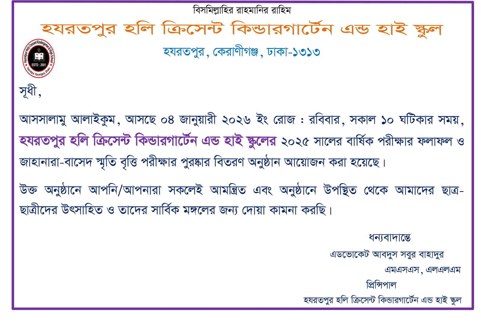 স্নেহের শিক্ষার্থী, সম্মানিত অভিভাবক ও প্রিয় সহকর্মী শিক্ষক মন্ডলী। সবাইকে জানাই আন্তরিক শুভেচ্ছা, ভালবাসা ও অভিনন্দন।